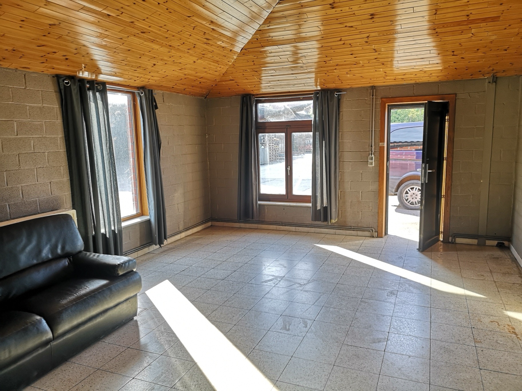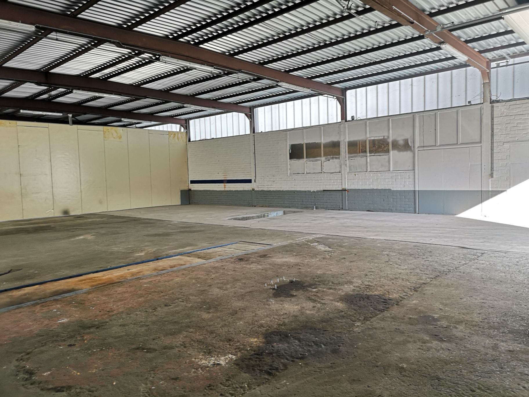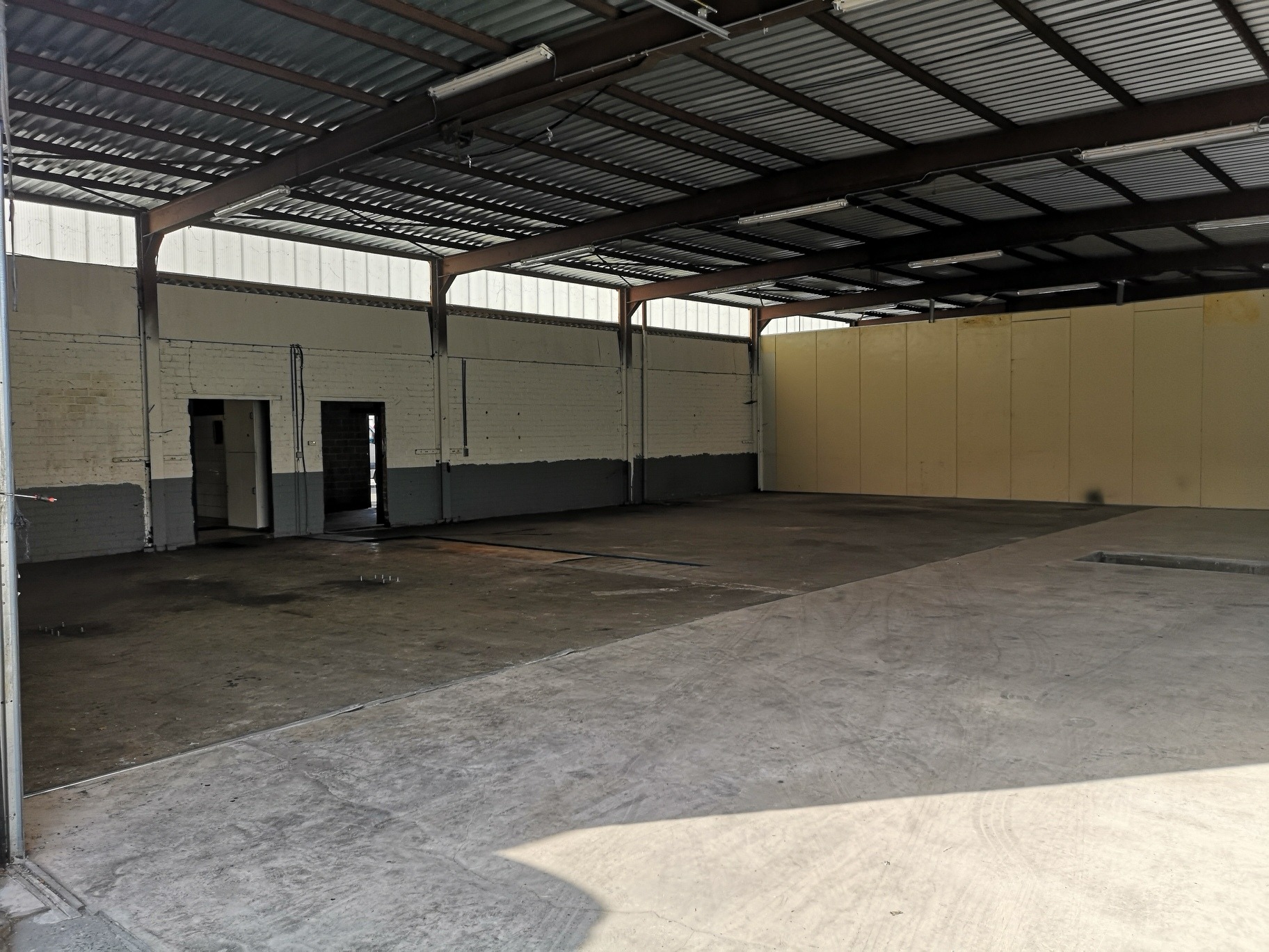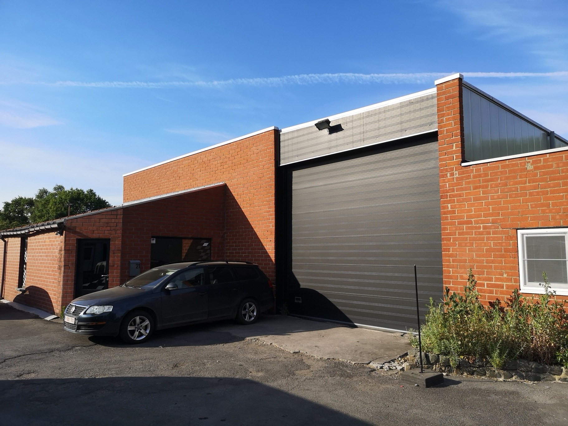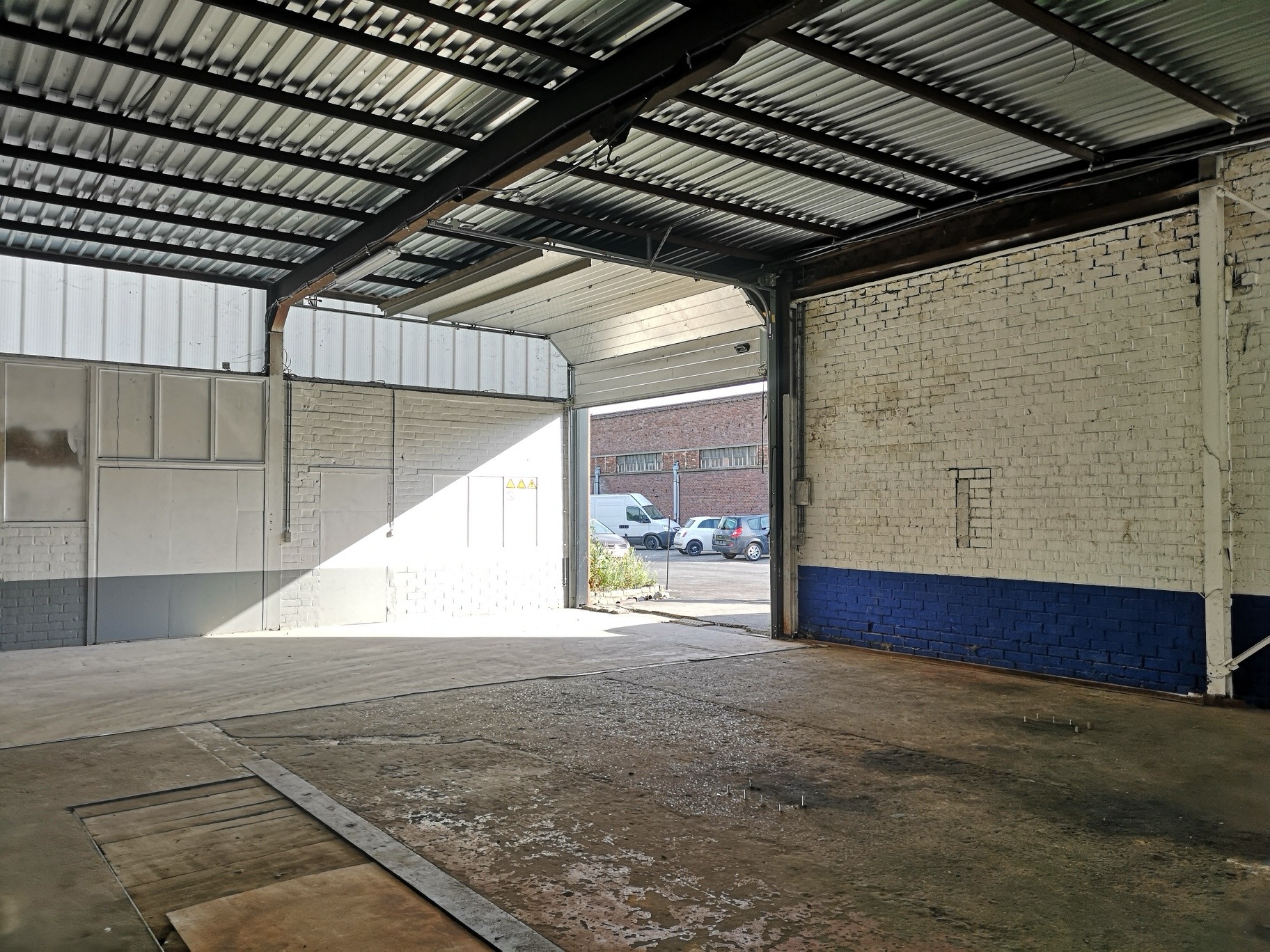 Magazijnruimte van +/- 350m² en 90m² burelen. Toegankelijk via een sectionale poort, mooie vrije hoogte en lichtrijk.