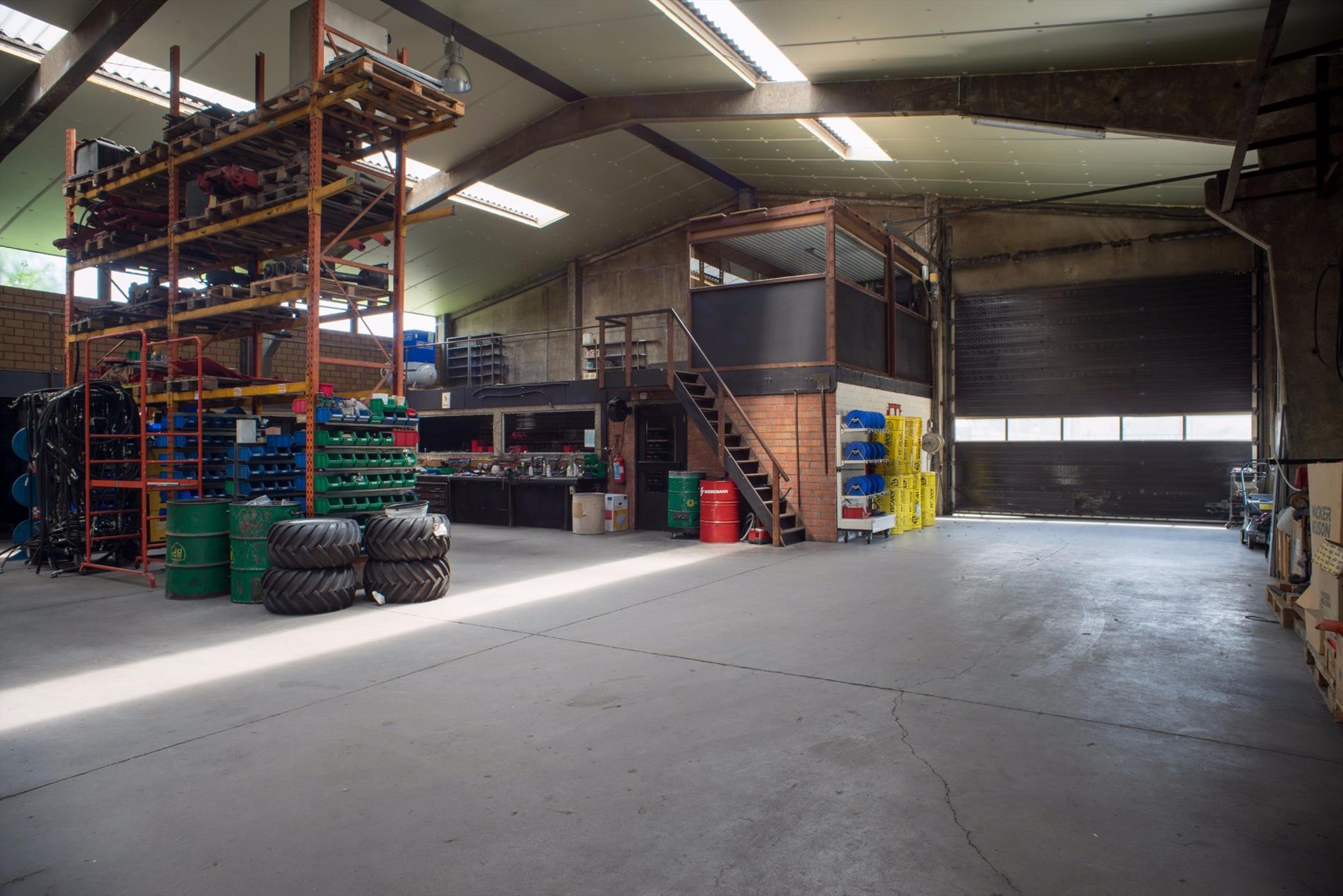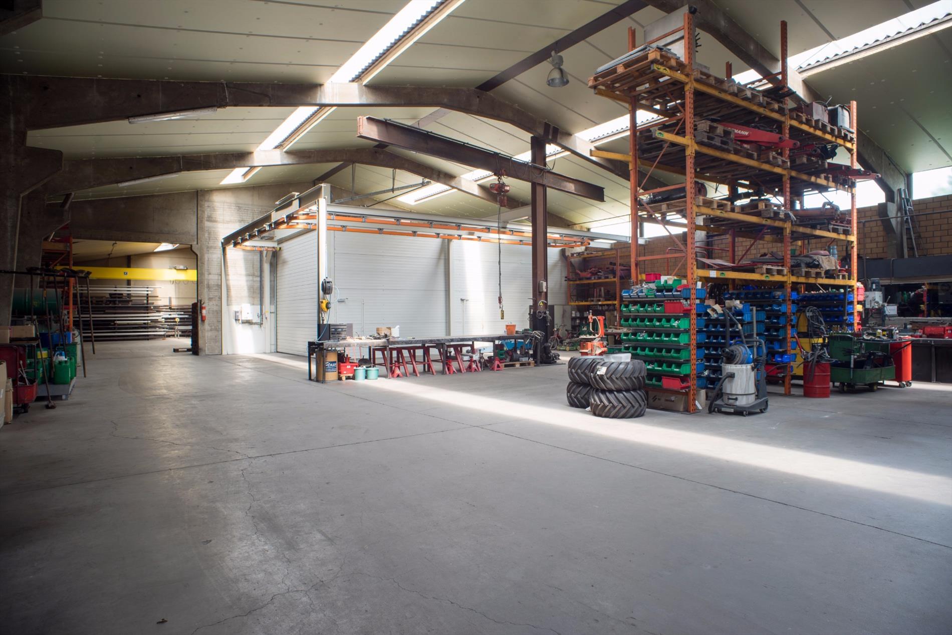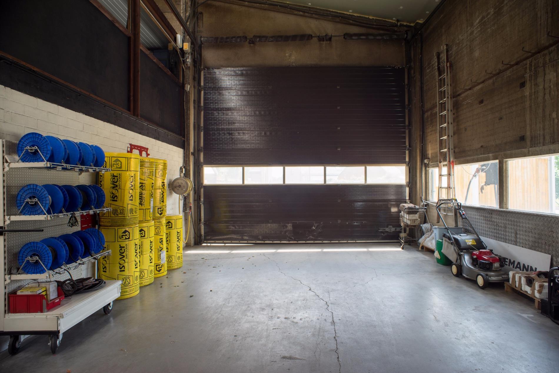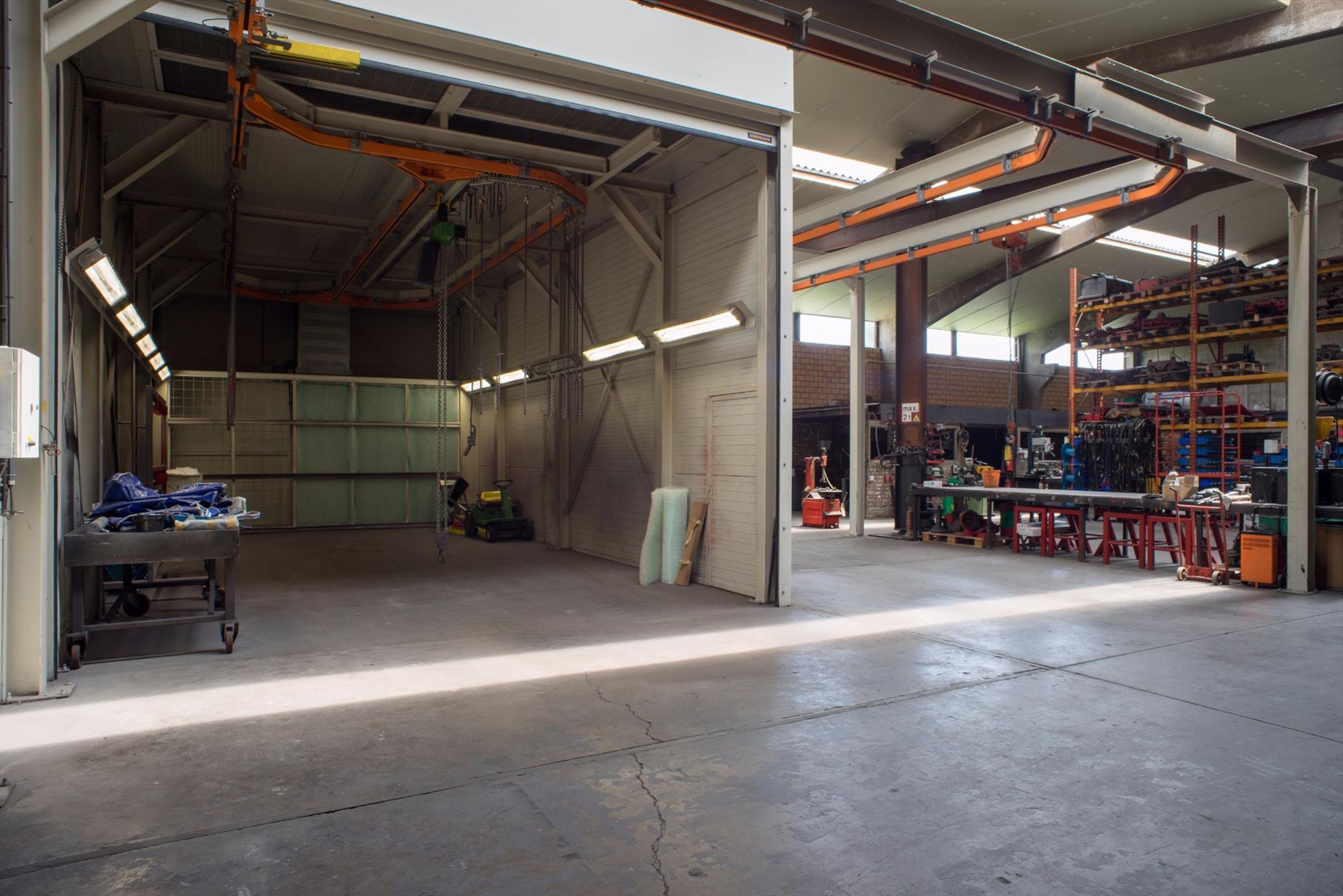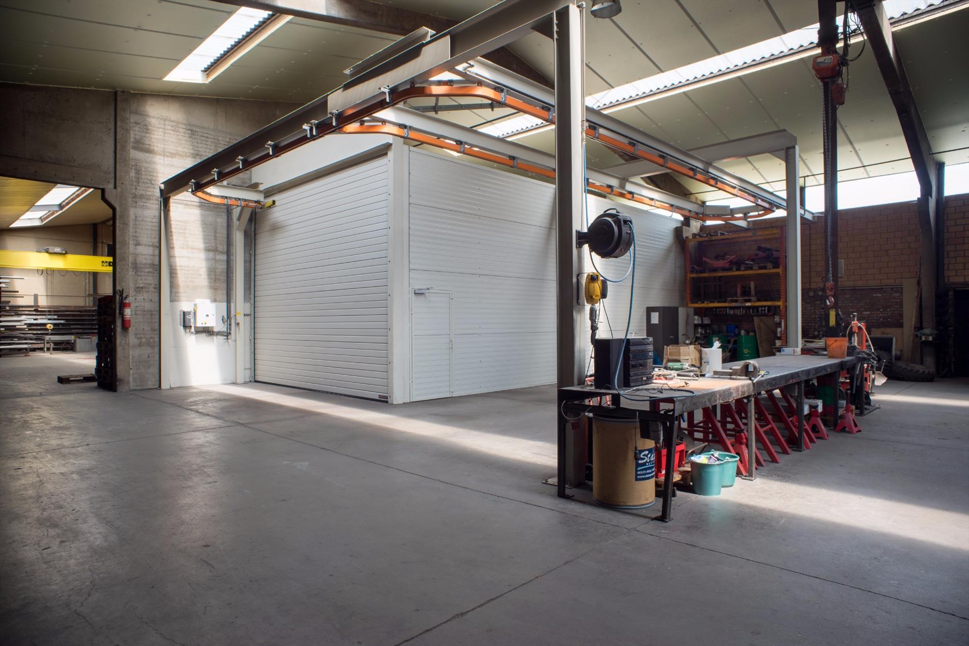 Loods (1130m²) in betonstructuur met geïsoleerd dak. Gedeelte 1: 660m² - Gedeelte 2: 470m² met rolbrug - Industriegebied. Magazijn opsplitsbaar te huur aan 2,50€/m².