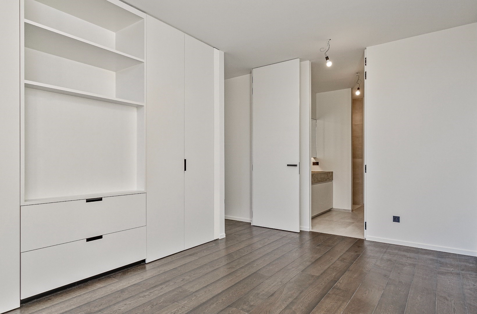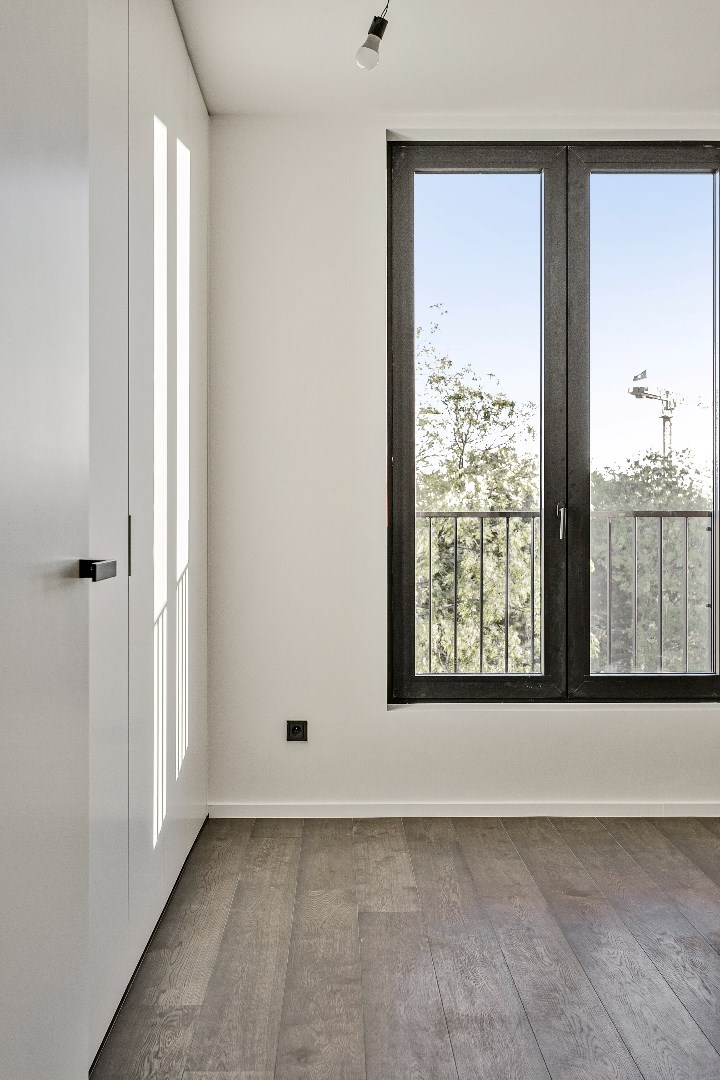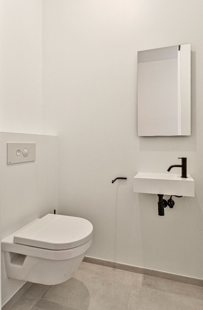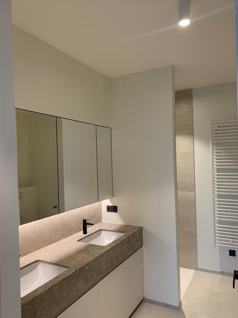 Bij de inrichting werd heel veel aandacht besteed aan een onberispelijke afwerking en het gebruik van superieure materialen. Zo is er een Wilfra keuken met Miele toestellen en werkbladen in schitterend anticato marmer. Er ligt overal parket en in de badkamers en toiletten een prachtige tegelvloer. Beide slaapkamers zijn afgewerkt met op maat gemaakte, kamerhoge kasten. De hoogwaardige verlichtingsarmaturen werden ondertussen ook geplaatst, dit was nog niet overal het geval op de foto's. Het verluchtingssysteem met warmterecuperatie zorgt samen met de vloerverwarming voor een aangenaam leefklimaat. De ruime hall met geïntegreerde vestiairekast, geeft toegang tot het afzonderlijk toilet en de grote berging.