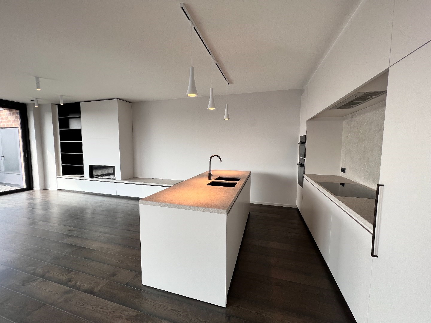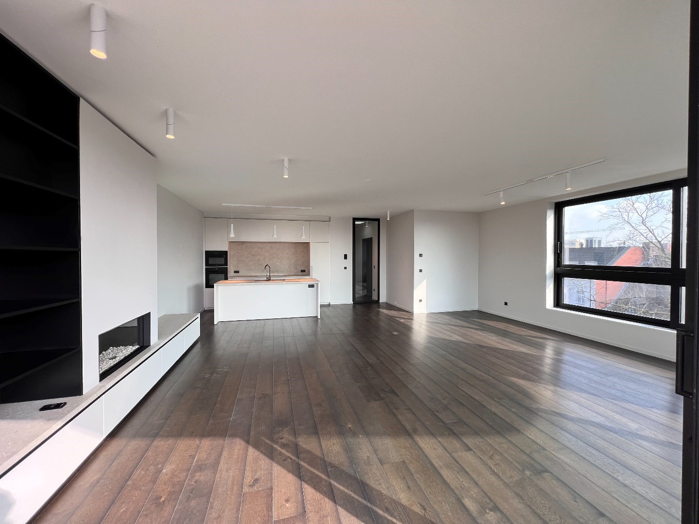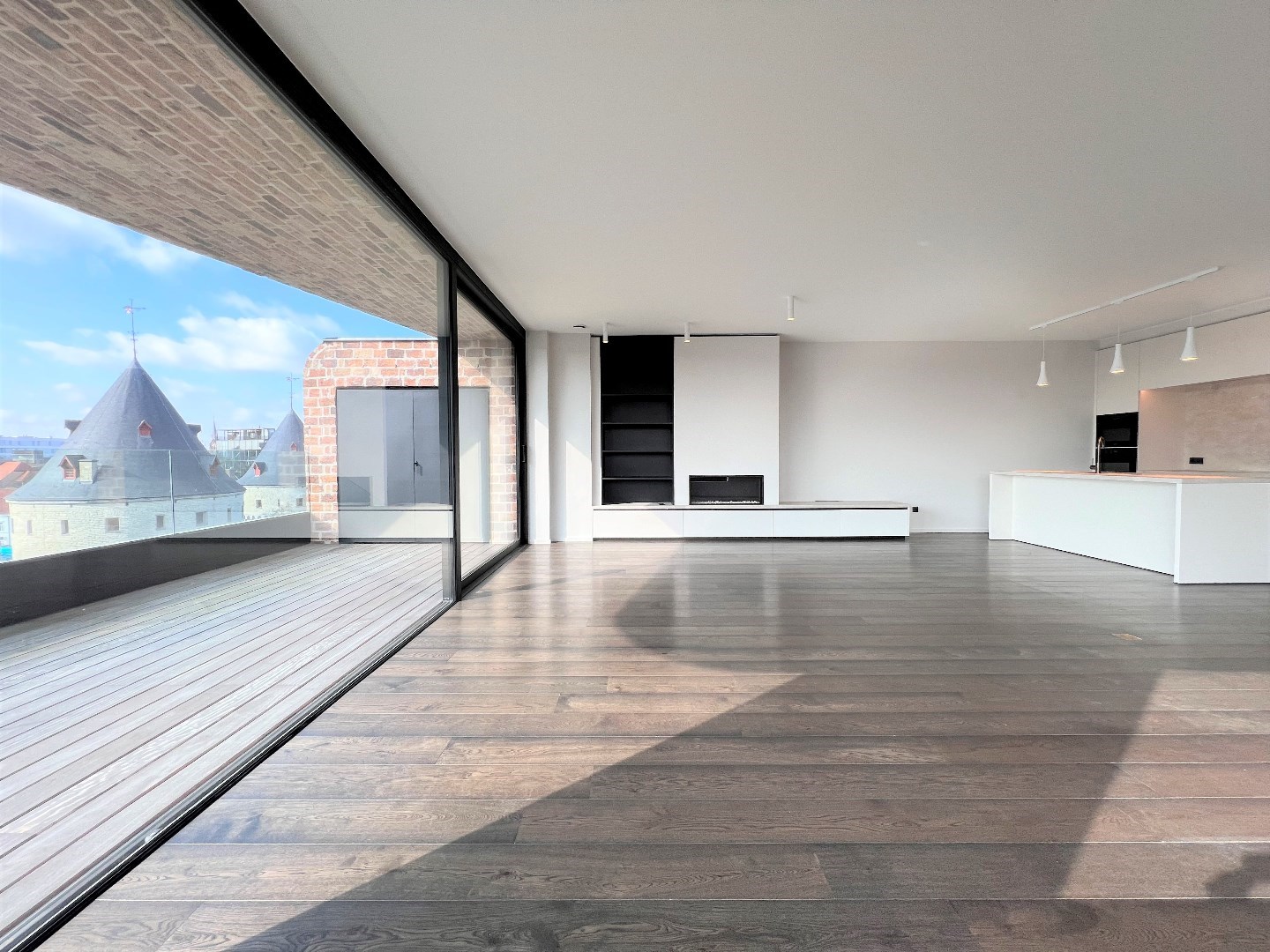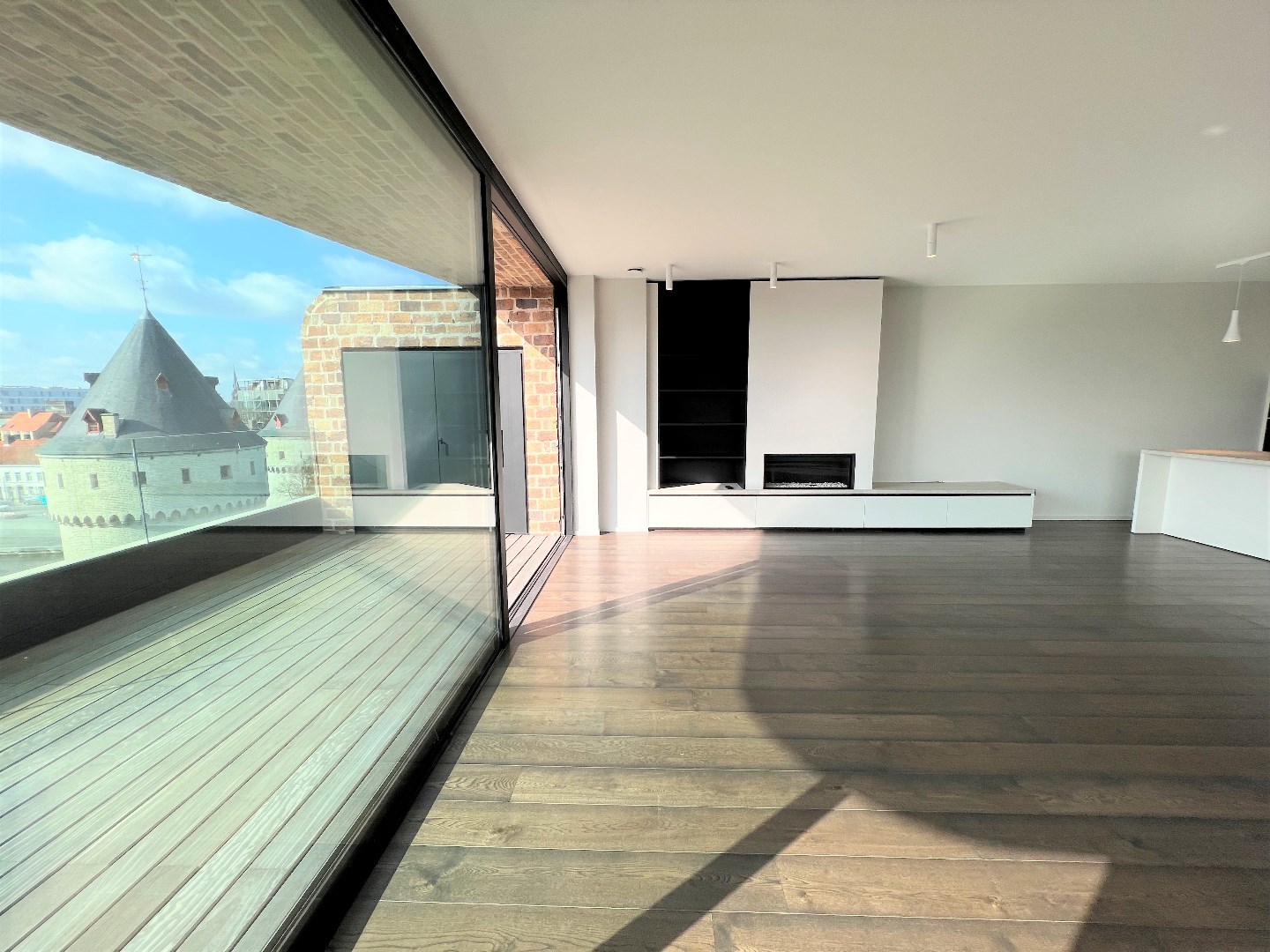 De 60m2 grote woonkamer is luxueus ingericht met design gashaard, kastenwand, parket en kamerbrede schuiframen naar het 29m2 groot terras, met hele dag zon.