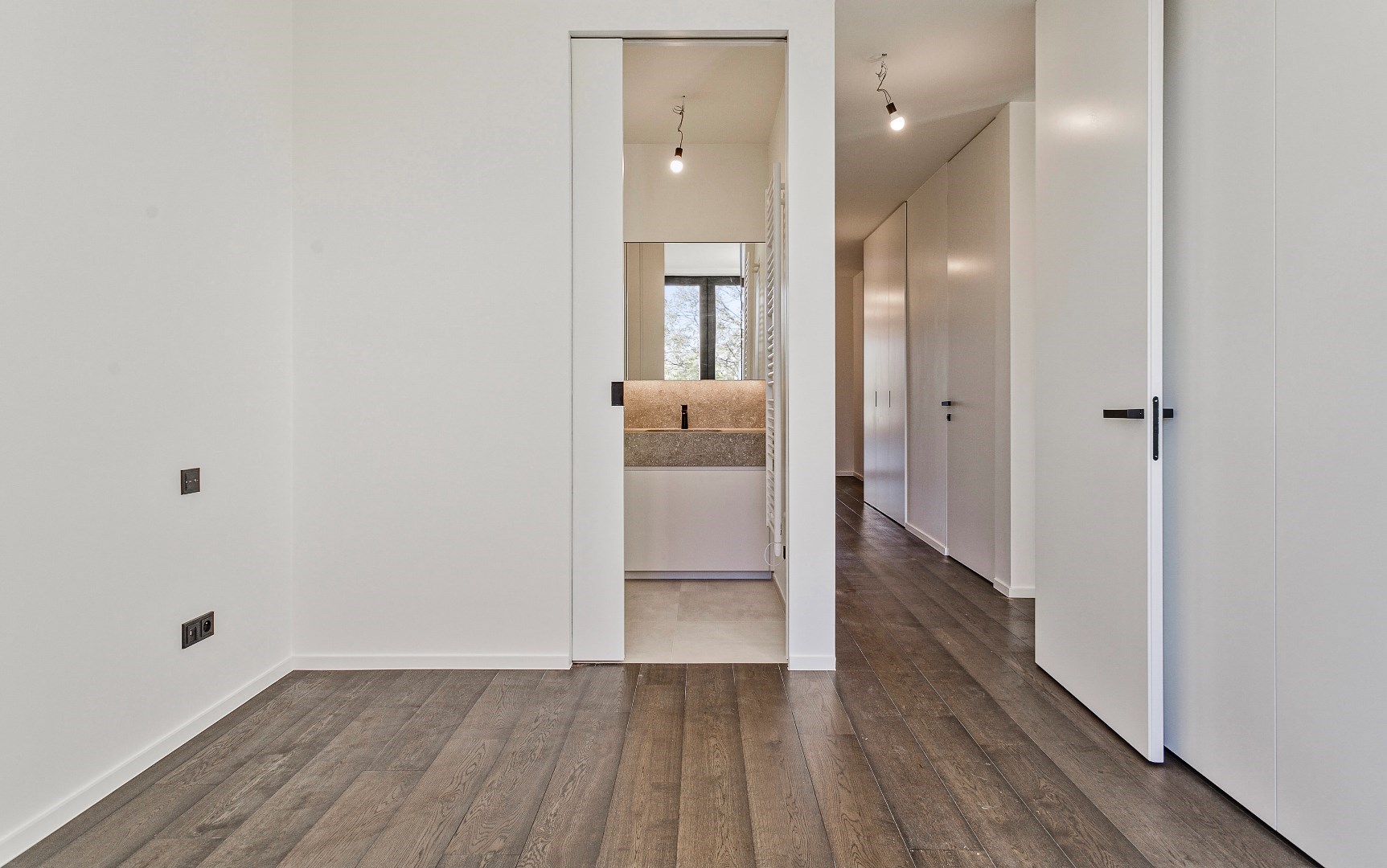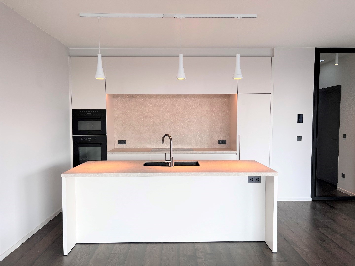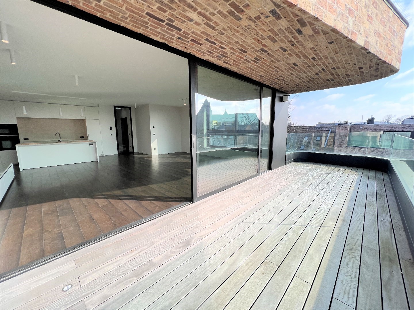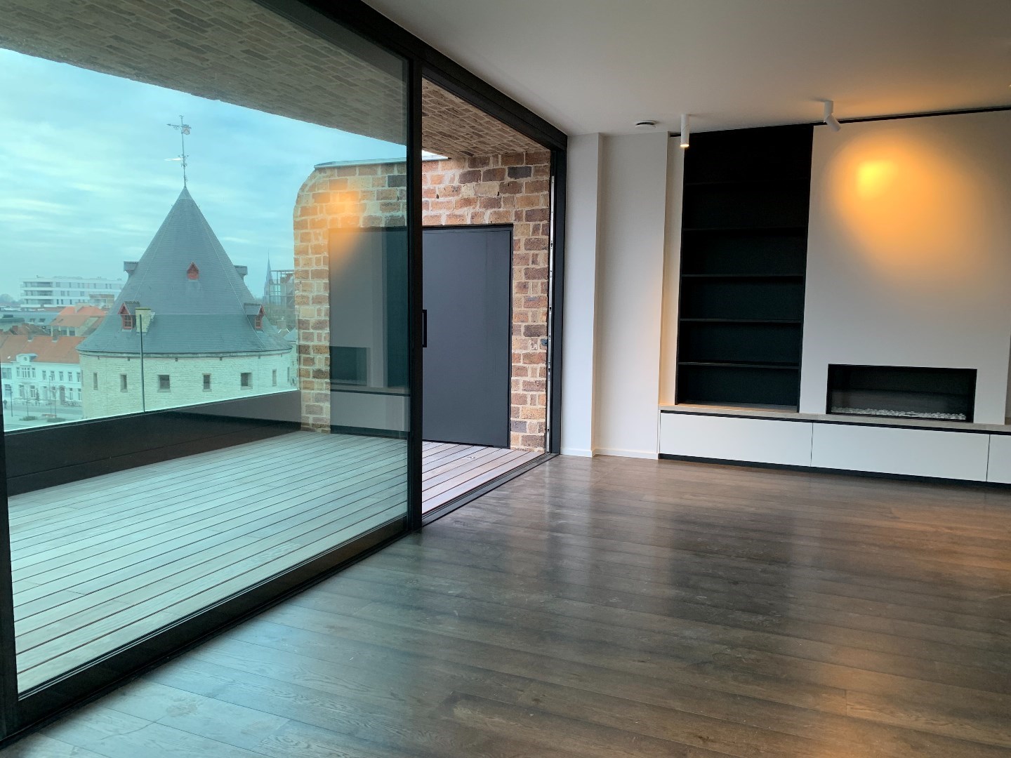 De 60m2 grote woonkamer is luxueus ingericht met design gashaard, kastenwand, parket en kamerbrede schuiframen naar het 29m2 groot terras, met hele dag zon.