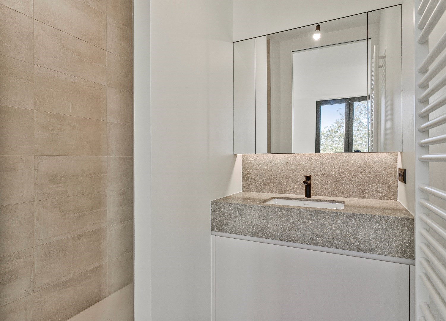 De 2 slaapkamers met elk een luxueuze badkamer kijken uit over de tuin Messeyne.