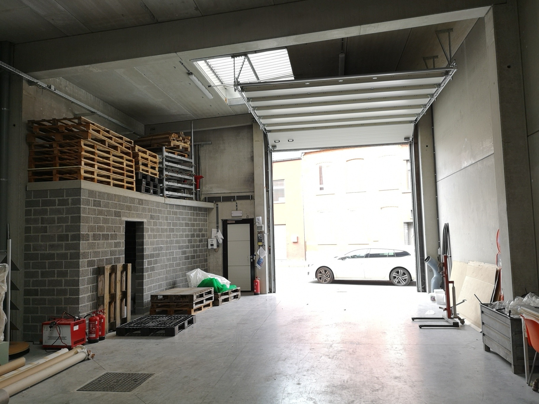 via een automatische sectionale poort en een afzonderlijke deur. De loods is afgewerkt met een poly-betonvloer, verlichting, stopcontacten,toilet,lichtkoepels en brandluiken ...! Gelegen tussen het centrum en de autosnelweg, vlotte bereikbaarheid.