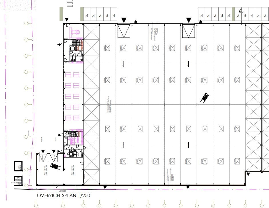 Optioneel kan er nog een aanpalende logistieke bedrijfshal bij gehuurd worden van 4069 m², en optioneel 1200 m² kantoren (350 m² + 425 m² + 425 m²).