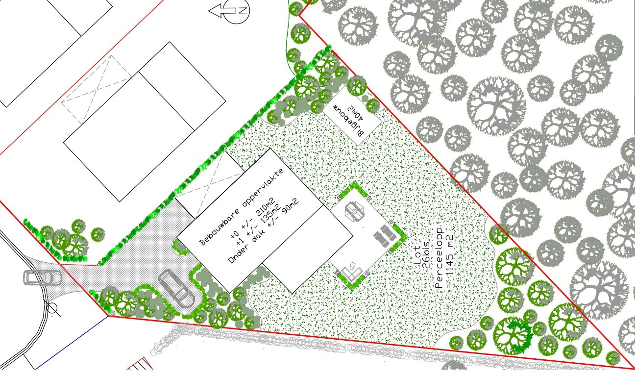 - Groot bouwvolume mogelijk (gelijkvloers = max. 210m², verdieping = max. 135m², evt. onder dak = +/-90m²)