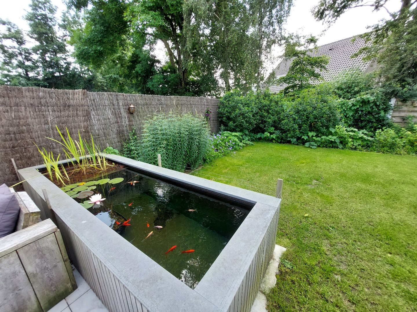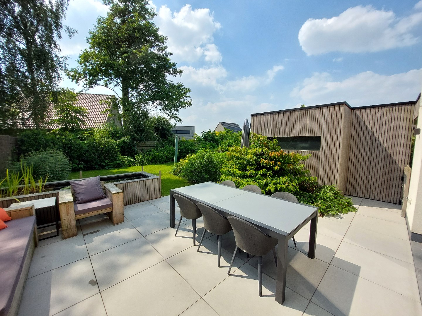 De sfeervolle tuin bestaat uit een zonneterras, visvijvertje, gazon met borders, kwalitatief tuinhuis met carport & oprit.
